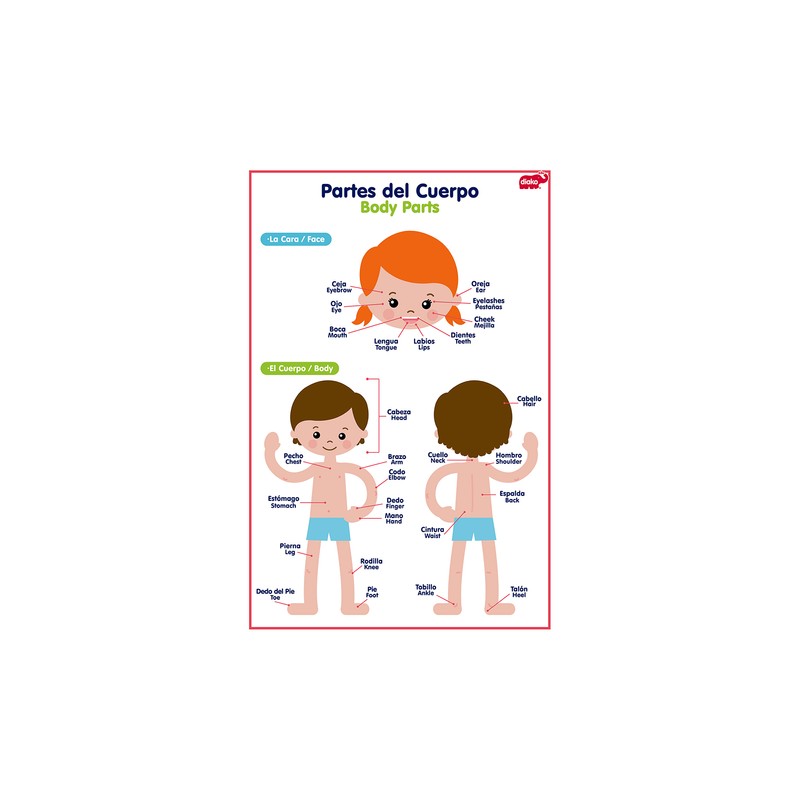 Lámina plastificada impresa por ambos lados. Contiene por un lado las partes del cuerpo y por el otro las prendas de vestir. Puedes escribir sobre ella con un marcador para pintarrón y al finalizar borrar con una tela húmeda.