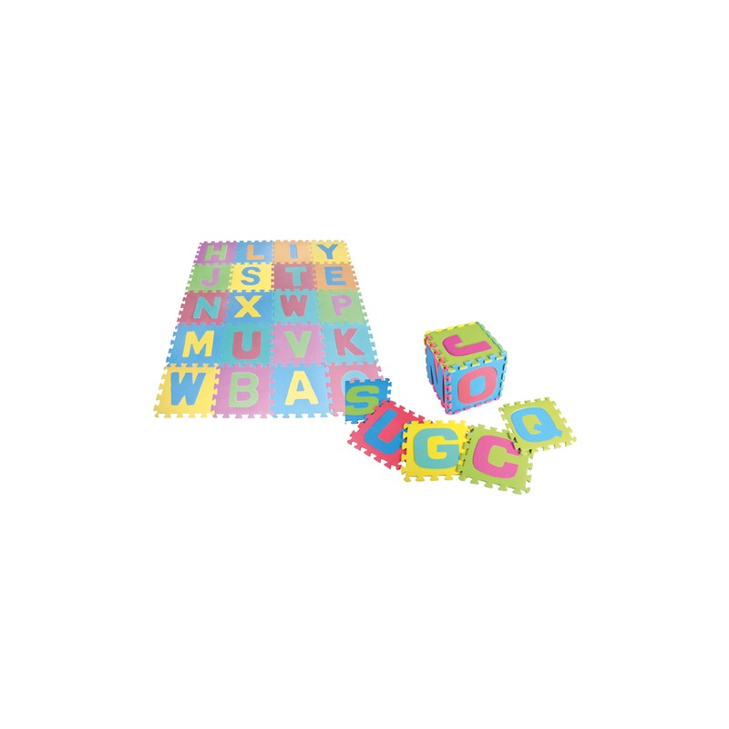 Tapete de plástico EVA para cubrir superficies. Contiene una letra en cada uno de sus paneles, la cual puede desprenderse. Tiene un grosor de 0.8 cm que ayuda a absorber el impacto y prevenir raspaduras en la piel de los niños.