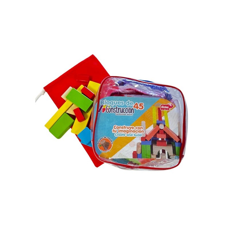 Bloques de madera de colores, para construir distintas estructuras utilizando tu imaginación. Contiene piezas con formas curvas, redondas, cuadradas y rectangulares. Facilita el aprendizaje de colores y figuras geométricas, ejercita la creatividad, la imaginación y la psicomotricidad fina.