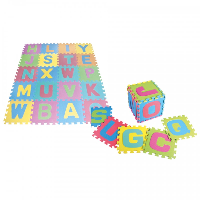 Tapete de plástico EVA para cubrir superficies. Contiene una letra en cada uno de sus paneles, la cual puede desprenderse. Tiene un grosor de 0.8 cm que ayuda a absorber el impacto y prevenir raspaduras en la piel de los niños.