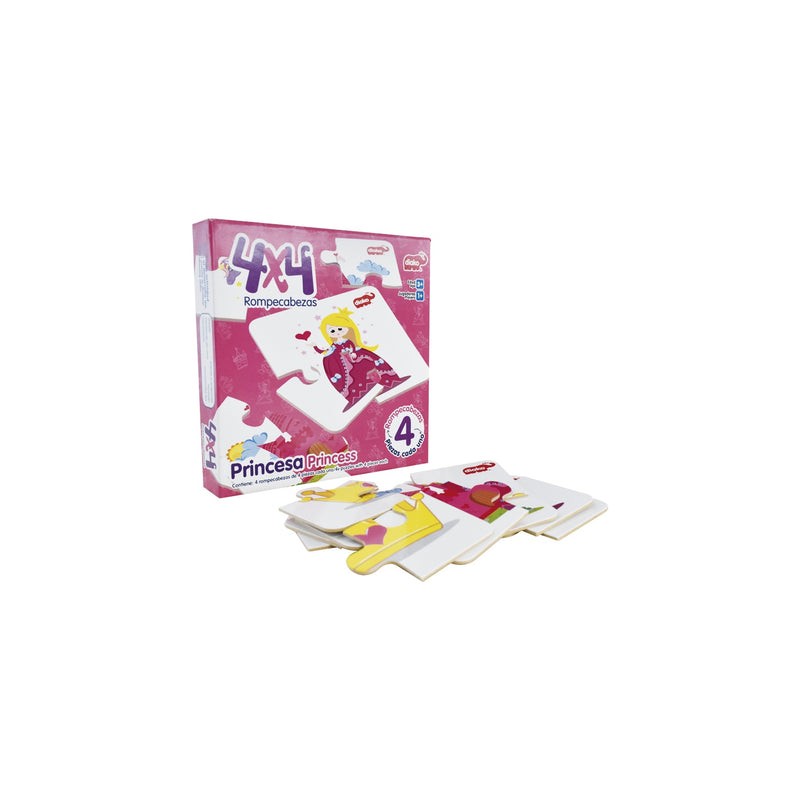 Son 4 rompecabezas con la figura de una princesa distinta y de 4 piezas cada uno. Ayuda a la introducción del rompecabezas, a identificar colores, apoya en la asociación de figuras y disminuye el estrés. Ideal para los más pequeños. Piezas: 16 (4 por cada rompecabezas). Medida: 21x21x4. Edad: 2+