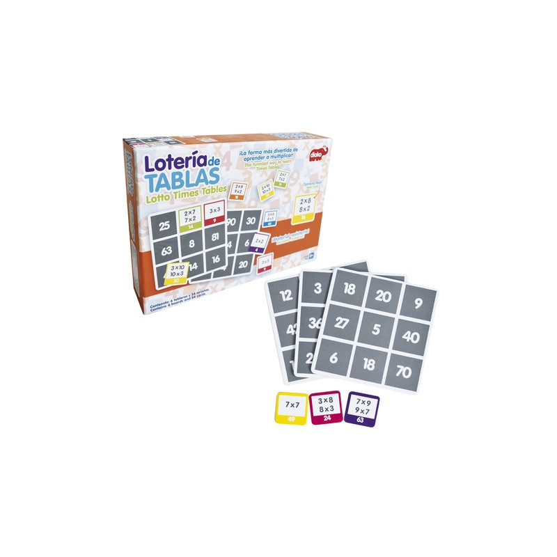 Lotería de cartón para aprender las tablas de multiplicar. Para ganar hay que saber los resultados de las multiplicaciones de tu tablero y completar una línea de 4 lo más rápido posible. Ayuda al aprendizaje de las tablas de multiplicar, al desarrollo lógico-matemático, al razonamiento y a la memoria.