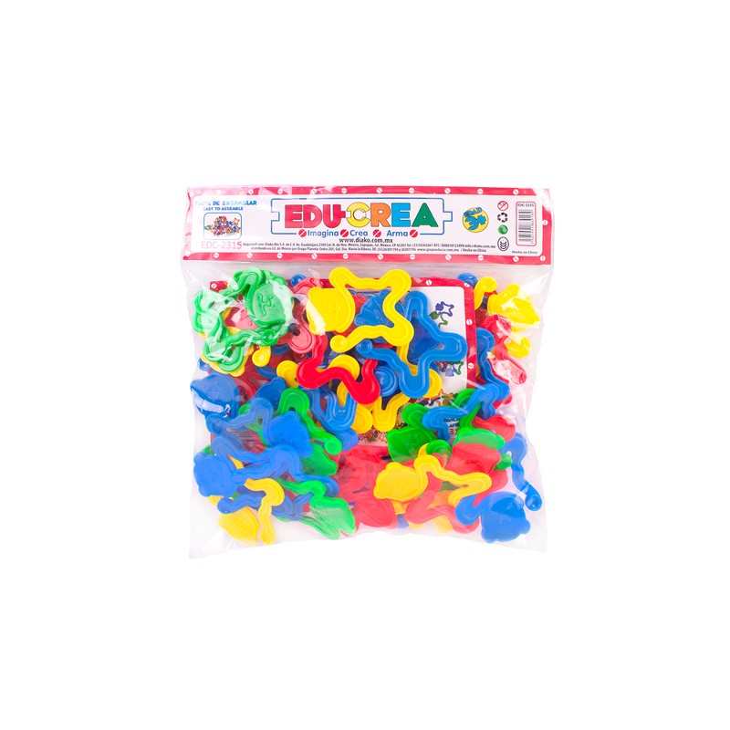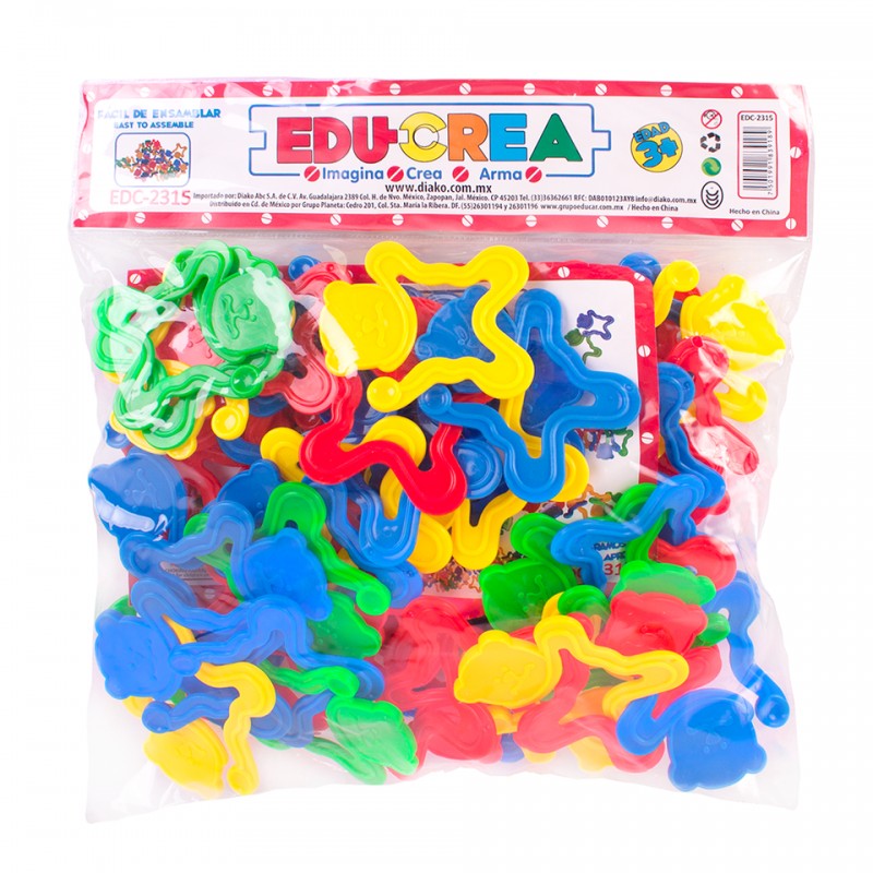 Juego de ensamble con piezas de plástico flexible que se unen entre sí para formar cadenas. Desarrolla las habilidades estratégicas, la coordinación ojo-mano, la psicomotricidad fina y la imaginación.