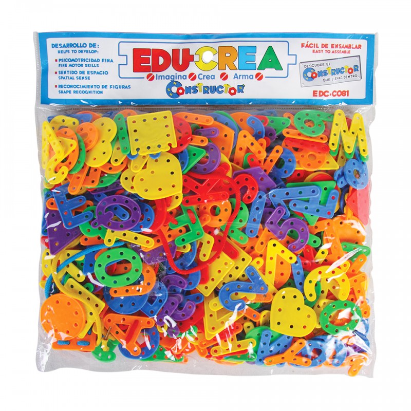Juego de ensartes con letras y números de plástico que contienen orificios para tejer con las cintas y formar cadenas. Apoya en la soltura de la muñeca para comenzar a escribir, el aprendizaje de colores, la psicomotricidad fina y el desarrollo creativo.