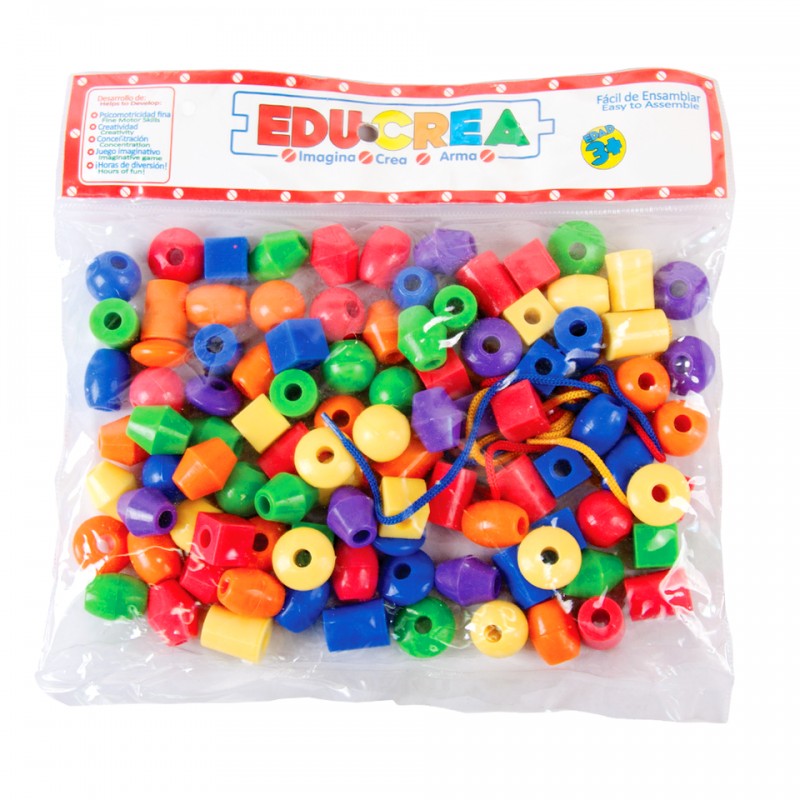 Juego de ensartes con cuentas y cintas para tejer y crear cadenas. Crea los diseños que tu imaginación te permita. Desarrolla las habilidades estratégicas, la coordinación ojo-mano, la psicomotricidad fina y la imaginación.